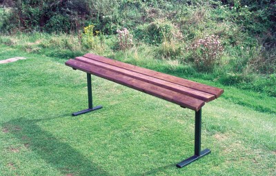 67” long x 24” high x 13” wide. Supplied with pressure treated stained timber seat, legs are made from heavy gauge box section, powder coated finish in dark green. Can be ground secured or free standing.